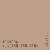 Цвет #BC9E8A в цветовой модели RGB обозначается тремя октетами (188, 158, 138) в десятичном формате и #BC9E8A в шестнадцатиричном (hex) формате, которые являются интенсивностью красного 188 (hex BC), интенсивность зелёного 158 (hex 9E) и интенсивность синего 138 (hex 8A).