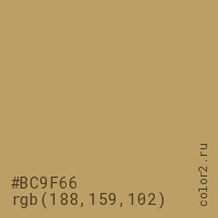 Цвет #BC9F66 в цветовой модели RGB обозначается тремя октетами (188, 159, 102) в десятичном формате и #BC9F66 в шестнадцатиричном (hex) формате, которые являются интенсивностью красного 188 (hex BC), интенсивность зелёного 159 (hex 9F) и интенсивность синего 102 (hex 66).