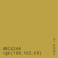 Цвет #BCA244 в цветовой модели RGB обозначается тремя октетами (188, 162, 68) в десятичном формате и #BCA244 в шестнадцатиричном (hex) формате, которые являются интенсивностью красного 188 (hex BC), интенсивность зелёного 162 (hex A2) и интенсивность синего 68 (hex 44).
