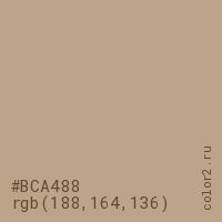 Цвет #BCA488 в цветовой модели RGB обозначается тремя октетами (188, 164, 136) в десятичном формате и #BCA488 в шестнадцатиричном (hex) формате, которые являются интенсивностью красного 188 (hex BC), интенсивность зелёного 164 (hex A4) и интенсивность синего 136 (hex 88).