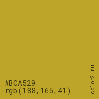Цвет #BCA529 в цветовой модели RGB обозначается тремя октетами (188, 165, 41) в десятичном формате и #BCA529 в шестнадцатиричном (hex) формате, которые являются интенсивностью красного 188 (hex BC), интенсивность зелёного 165 (hex A5) и интенсивность синего 41 (hex 29).