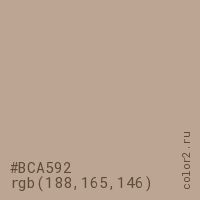 Цвет #BCA592 в цветовой модели RGB обозначается тремя октетами (188, 165, 146) в десятичном формате и #BCA592 в шестнадцатиричном (hex) формате, которые являются интенсивностью красного 188 (hex BC), интенсивность зелёного 165 (hex A5) и интенсивность синего 146 (hex 92).