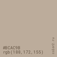 Цвет #BCAC9B в цветовой модели RGB обозначается тремя октетами (188, 172, 155) в десятичном формате и #BCAC9B в шестнадцатиричном (hex) формате, которые являются интенсивностью красного 188 (hex BC), интенсивность зелёного 172 (hex AC) и интенсивность синего 155 (hex 9B).
