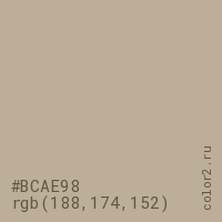 Цвет #BCAE98 в цветовой модели RGB обозначается тремя октетами (188, 174, 152) в десятичном формате и #BCAE98 в шестнадцатиричном (hex) формате, которые являются интенсивностью красного 188 (hex BC), интенсивность зелёного 174 (hex AE) и интенсивность синего 152 (hex 98).