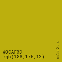 Цвет #BCAF0D в цветовой модели RGB обозначается тремя октетами (188, 175, 13) в десятичном формате и #BCAF0D в шестнадцатиричном (hex) формате, которые являются интенсивностью красного 188 (hex BC), интенсивность зелёного 175 (hex AF) и интенсивность синего 13 (hex 0D).