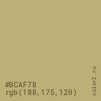Цвет #BCAF78 в цветовой модели RGB обозначается тремя октетами (188, 175, 120) в десятичном формате и #BCAF78 в шестнадцатиричном (hex) формате, которые являются интенсивностью красного 188 (hex BC), интенсивность зелёного 175 (hex AF) и интенсивность синего 120 (hex 78).