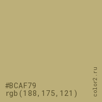 Цвет #BCAF79 в цветовой модели RGB обозначается тремя октетами (188, 175, 121) в десятичном формате и #BCAF79 в шестнадцатиричном (hex) формате, которые являются интенсивностью красного 188 (hex BC), интенсивность зелёного 175 (hex AF) и интенсивность синего 121 (hex 79).