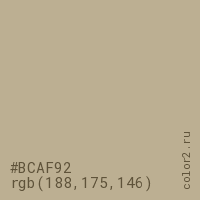 Цвет #BCAF92 в цветовой модели RGB обозначается тремя октетами (188, 175, 146) в десятичном формате и #BCAF92 в шестнадцатиричном (hex) формате, которые являются интенсивностью красного 188 (hex BC), интенсивность зелёного 175 (hex AF) и интенсивность синего 146 (hex 92).
