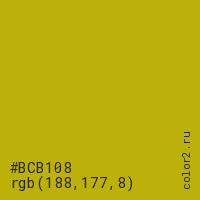 Цвет #BCB108 в цветовой модели RGB обозначается тремя октетами (188, 177, 8) в десятичном формате и #BCB108 в шестнадцатиричном (hex) формате, которые являются интенсивностью красного 188 (hex BC), интенсивность зелёного 177 (hex B1) и интенсивность синего 8 (hex 08).