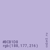 Цвет #BCB1D8 в цветовой модели RGB обозначается тремя октетами (188, 177, 216) в десятичном формате и #BCB1D8 в шестнадцатиричном (hex) формате, которые являются интенсивностью красного 188 (hex BC), интенсивность зелёного 177 (hex B1) и интенсивность синего 216 (hex D8).
