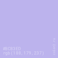 Цвет #BCB3ED в цветовой модели RGB обозначается тремя октетами (188, 179, 237) в десятичном формате и #BCB3ED в шестнадцатиричном (hex) формате, которые являются интенсивностью красного 188 (hex BC), интенсивность зелёного 179 (hex B3) и интенсивность синего 237 (hex ED).