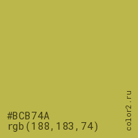 Цвет #BCB74A в цветовой модели RGB обозначается тремя октетами (188, 183, 74) в десятичном формате и #BCB74A в шестнадцатиричном (hex) формате, которые являются интенсивностью красного 188 (hex BC), интенсивность зелёного 183 (hex B7) и интенсивность синего 74 (hex 4A).