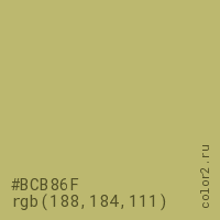 Цвет #BCB86F в цветовой модели RGB обозначается тремя октетами (188, 184, 111) в десятичном формате и #BCB86F в шестнадцатиричном (hex) формате, которые являются интенсивностью красного 188 (hex BC), интенсивность зелёного 184 (hex B8) и интенсивность синего 111 (hex 6F).