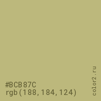 Цвет #BCB87C в цветовой модели RGB обозначается тремя октетами (188, 184, 124) в десятичном формате и #BCB87C в шестнадцатиричном (hex) формате, которые являются интенсивностью красного 188 (hex BC), интенсивность зелёного 184 (hex B8) и интенсивность синего 124 (hex 7C).