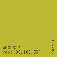 Цвет #BCB932 в цветовой модели RGB обозначается тремя октетами (188, 185, 50) в десятичном формате и #BCB932 в шестнадцатиричном (hex) формате, которые являются интенсивностью красного 188 (hex BC), интенсивность зелёного 185 (hex B9) и интенсивность синего 50 (hex 32).