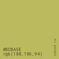 Цвет #BCBA5E в цветовой модели RGB обозначается тремя октетами (188, 186, 94) в десятичном формате и #BCBA5E в шестнадцатиричном (hex) формате, которые являются интенсивностью красного 188 (hex BC), интенсивность зелёного 186 (hex BA) и интенсивность синего 94 (hex 5E).