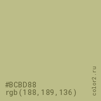 Цвет #BCBD88 в цветовой модели RGB обозначается тремя октетами (188, 189, 136) в десятичном формате и #BCBD88 в шестнадцатиричном (hex) формате, которые являются интенсивностью красного 188 (hex BC), интенсивность зелёного 189 (hex BD) и интенсивность синего 136 (hex 88).