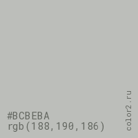 Цвет #BCBEBA в цветовой модели RGB обозначается тремя октетами (188, 190, 186) в десятичном формате и #BCBEBA в шестнадцатиричном (hex) формате, которые являются интенсивностью красного 188 (hex BC), интенсивность зелёного 190 (hex BE) и интенсивность синего 186 (hex BA).