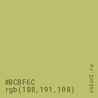 Цвет #BCBF6C в цветовой модели RGB обозначается тремя октетами (188, 191, 108) в десятичном формате и #BCBF6C в шестнадцатиричном (hex) формате, которые являются интенсивностью красного 188 (hex BC), интенсивность зелёного 191 (hex BF) и интенсивность синего 108 (hex 6C).
