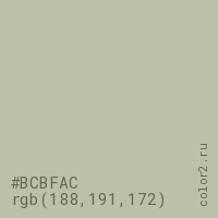 Цвет #BCBFAC в цветовой модели RGB обозначается тремя октетами (188, 191, 172) в десятичном формате и #BCBFAC в шестнадцатиричном (hex) формате, которые являются интенсивностью красного 188 (hex BC), интенсивность зелёного 191 (hex BF) и интенсивность синего 172 (hex AC).