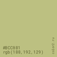 Цвет #BCC081 в цветовой модели RGB обозначается тремя октетами (188, 192, 129) в десятичном формате и #BCC081 в шестнадцатиричном (hex) формате, которые являются интенсивностью красного 188 (hex BC), интенсивность зелёного 192 (hex C0) и интенсивность синего 129 (hex 81).