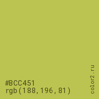 Цвет #BCC451 в цветовой модели RGB обозначается тремя октетами (188, 196, 81) в десятичном формате и #BCC451 в шестнадцатиричном (hex) формате, которые являются интенсивностью красного 188 (hex BC), интенсивность зелёного 196 (hex C4) и интенсивность синего 81 (hex 51).