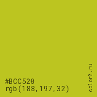 Цвет #BCC520 в цветовой модели RGB обозначается тремя октетами (188, 197, 32) в десятичном формате и #BCC520 в шестнадцатиричном (hex) формате, которые являются интенсивностью красного 188 (hex BC), интенсивность зелёного 197 (hex C5) и интенсивность синего 32 (hex 20).