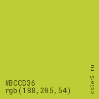 Цвет #BCCD36 в цветовой модели RGB обозначается тремя октетами (188, 205, 54) в десятичном формате и #BCCD36 в шестнадцатиричном (hex) формате, которые являются интенсивностью красного 188 (hex BC), интенсивность зелёного 205 (hex CD) и интенсивность синего 54 (hex 36).