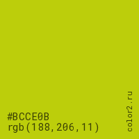 Цвет #BCCE0B в цветовой модели RGB обозначается тремя октетами (188, 206, 11) в десятичном формате и #BCCE0B в шестнадцатиричном (hex) формате, которые являются интенсивностью красного 188 (hex BC), интенсивность зелёного 206 (hex CE) и интенсивность синего 11 (hex 0B).