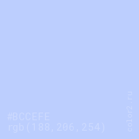 Цвет #BCCEFE в цветовой модели RGB обозначается тремя октетами (188, 206, 254) в десятичном формате и #BCCEFE в шестнадцатиричном (hex) формате, которые являются интенсивностью красного 188 (hex BC), интенсивность зелёного 206 (hex CE) и интенсивность синего 254 (hex FE).