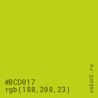 Цвет #BCD017 в цветовой модели RGB обозначается тремя октетами (188, 208, 23) в десятичном формате и #BCD017 в шестнадцатиричном (hex) формате, которые являются интенсивностью красного 188 (hex BC), интенсивность зелёного 208 (hex D0) и интенсивность синего 23 (hex 17).