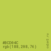 Цвет #BCD04C в цветовой модели RGB обозначается тремя октетами (188, 208, 76) в десятичном формате и #BCD04C в шестнадцатиричном (hex) формате, которые являются интенсивностью красного 188 (hex BC), интенсивность зелёного 208 (hex D0) и интенсивность синего 76 (hex 4C).