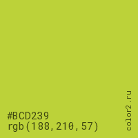 Цвет #BCD239 в цветовой модели RGB обозначается тремя октетами (188, 210, 57) в десятичном формате и #BCD239 в шестнадцатиричном (hex) формате, которые являются интенсивностью красного 188 (hex BC), интенсивность зелёного 210 (hex D2) и интенсивность синего 57 (hex 39).