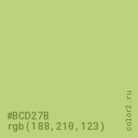 Цвет #BCD27B в цветовой модели RGB обозначается тремя октетами (188, 210, 123) в десятичном формате и #BCD27B в шестнадцатиричном (hex) формате, которые являются интенсивностью красного 188 (hex BC), интенсивность зелёного 210 (hex D2) и интенсивность синего 123 (hex 7B).