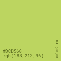 Цвет #BCD560 в цветовой модели RGB обозначается тремя октетами (188, 213, 96) в десятичном формате и #BCD560 в шестнадцатиричном (hex) формате, которые являются интенсивностью красного 188 (hex BC), интенсивность зелёного 213 (hex D5) и интенсивность синего 96 (hex 60).
