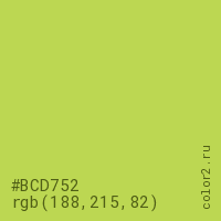 Цвет #BCD752 в цветовой модели RGB обозначается тремя октетами (188, 215, 82) в десятичном формате и #BCD752 в шестнадцатиричном (hex) формате, которые являются интенсивностью красного 188 (hex BC), интенсивность зелёного 215 (hex D7) и интенсивность синего 82 (hex 52).