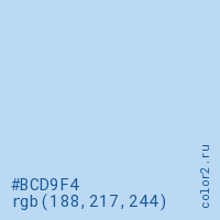 Цвет #BCD9F4 в цветовой модели RGB обозначается тремя октетами (188, 217, 244) в десятичном формате и #BCD9F4 в шестнадцатиричном (hex) формате, которые являются интенсивностью красного 188 (hex BC), интенсивность зелёного 217 (hex D9) и интенсивность синего 244 (hex F4).