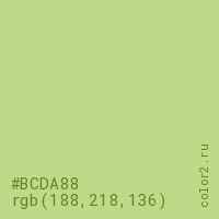 Цвет #BCDA88 в цветовой модели RGB обозначается тремя октетами (188, 218, 136) в десятичном формате и #BCDA88 в шестнадцатиричном (hex) формате, которые являются интенсивностью красного 188 (hex BC), интенсивность зелёного 218 (hex DA) и интенсивность синего 136 (hex 88).
