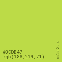 Цвет #BCDB47 в цветовой модели RGB обозначается тремя октетами (188, 219, 71) в десятичном формате и #BCDB47 в шестнадцатиричном (hex) формате, которые являются интенсивностью красного 188 (hex BC), интенсивность зелёного 219 (hex DB) и интенсивность синего 71 (hex 47).
