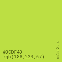 Цвет #BCDF43 в цветовой модели RGB обозначается тремя октетами (188, 223, 67) в десятичном формате и #BCDF43 в шестнадцатиричном (hex) формате, которые являются интенсивностью красного 188 (hex BC), интенсивность зелёного 223 (hex DF) и интенсивность синего 67 (hex 43).