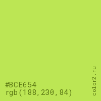 Цвет #BCE654 в цветовой модели RGB обозначается тремя октетами (188, 230, 84) в десятичном формате и #BCE654 в шестнадцатиричном (hex) формате, которые являются интенсивностью красного 188 (hex BC), интенсивность зелёного 230 (hex E6) и интенсивность синего 84 (hex 54).