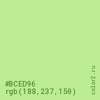 Цвет #BCED96 в цветовой модели RGB обозначается тремя октетами (188, 237, 150) в десятичном формате и #BCED96 в шестнадцатиричном (hex) формате, которые являются интенсивностью красного 188 (hex BC), интенсивность зелёного 237 (hex ED) и интенсивность синего 150 (hex 96).