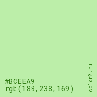 Цвет #BCEEA9 в цветовой модели RGB обозначается тремя октетами (188, 238, 169) в десятичном формате и #BCEEA9 в шестнадцатиричном (hex) формате, которые являются интенсивностью красного 188 (hex BC), интенсивность зелёного 238 (hex EE) и интенсивность синего 169 (hex A9).