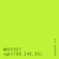 Цвет #BCF337 в цветовой модели RGB обозначается тремя октетами (188, 243, 55) в десятичном формате и #BCF337 в шестнадцатиричном (hex) формате, которые являются интенсивностью красного 188 (hex BC), интенсивность зелёного 243 (hex F3) и интенсивность синего 55 (hex 37).