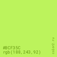 Цвет #BCF35C в цветовой модели RGB обозначается тремя октетами (188, 243, 92) в десятичном формате и #BCF35C в шестнадцатиричном (hex) формате, которые являются интенсивностью красного 188 (hex BC), интенсивность зелёного 243 (hex F3) и интенсивность синего 92 (hex 5C).