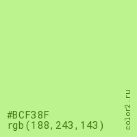 Цвет #BCF38F в цветовой модели RGB обозначается тремя октетами (188, 243, 143) в десятичном формате и #BCF38F в шестнадцатиричном (hex) формате, которые являются интенсивностью красного 188 (hex BC), интенсивность зелёного 243 (hex F3) и интенсивность синего 143 (hex 8F).