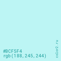 Цвет #BCF5F4 в цветовой модели RGB обозначается тремя октетами (188, 245, 244) в десятичном формате и #BCF5F4 в шестнадцатиричном (hex) формате, которые являются интенсивностью красного 188 (hex BC), интенсивность зелёного 245 (hex F5) и интенсивность синего 244 (hex F4).