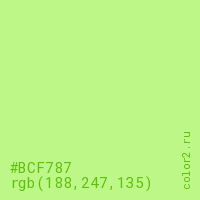 Цвет #BCF787 в цветовой модели RGB обозначается тремя октетами (188, 247, 135) в десятичном формате и #BCF787 в шестнадцатиричном (hex) формате, которые являются интенсивностью красного 188 (hex BC), интенсивность зелёного 247 (hex F7) и интенсивность синего 135 (hex 87).