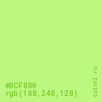 Цвет #BCF880 в цветовой модели RGB обозначается тремя октетами (188, 248, 128) в десятичном формате и #BCF880 в шестнадцатиричном (hex) формате, которые являются интенсивностью красного 188 (hex BC), интенсивность зелёного 248 (hex F8) и интенсивность синего 128 (hex 80).
