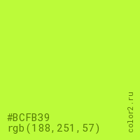Цвет #BCFB39 в цветовой модели RGB обозначается тремя октетами (188, 251, 57) в десятичном формате и #BCFB39 в шестнадцатиричном (hex) формате, которые являются интенсивностью красного 188 (hex BC), интенсивность зелёного 251 (hex FB) и интенсивность синего 57 (hex 39).